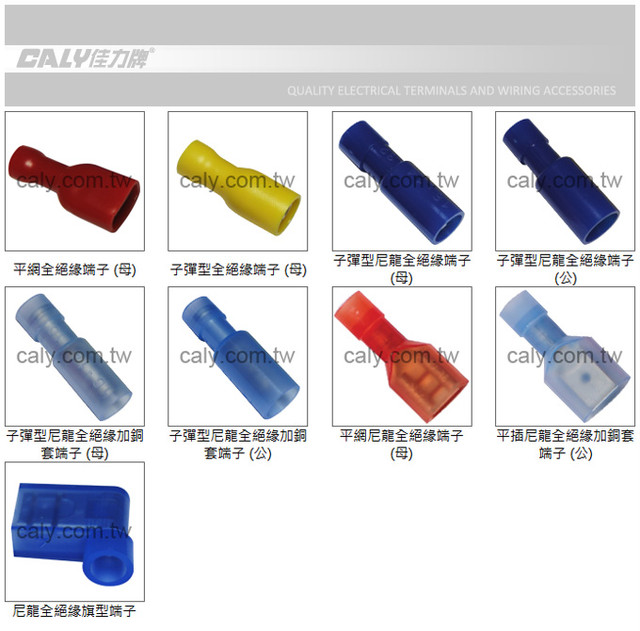 全絕緣端子, 平網全絕緣端子, 子彈型絕緣端子, 子彈型尼龍全絕緣端子, 尼龍全絕緣旗型端子